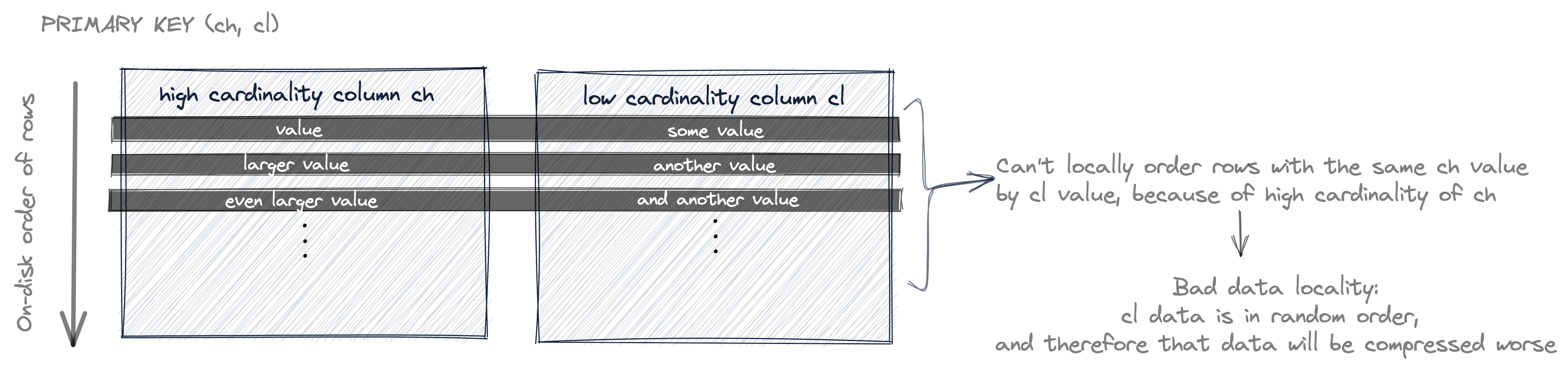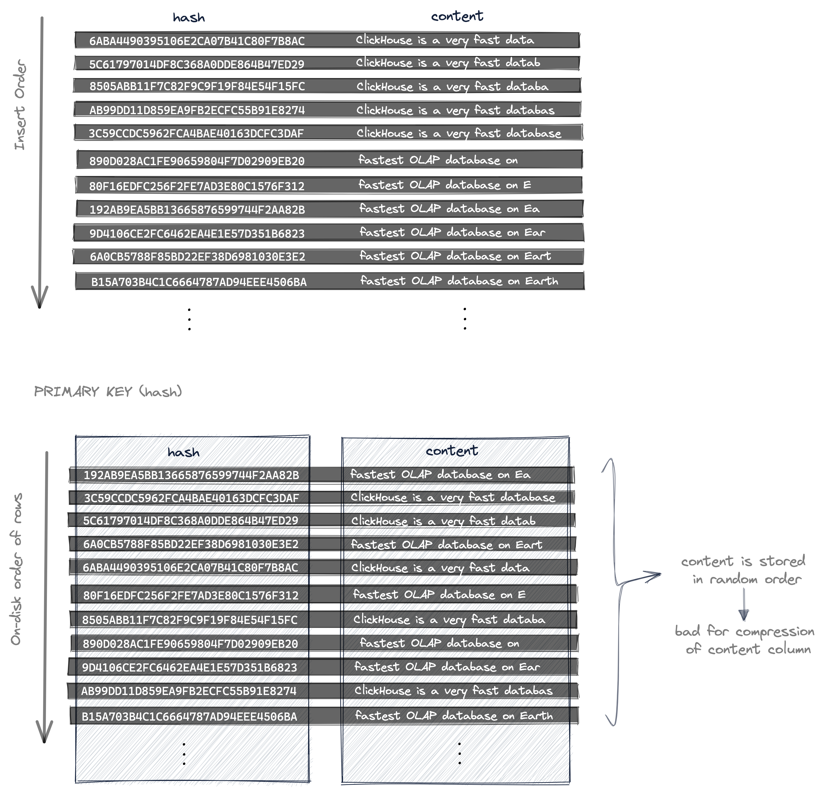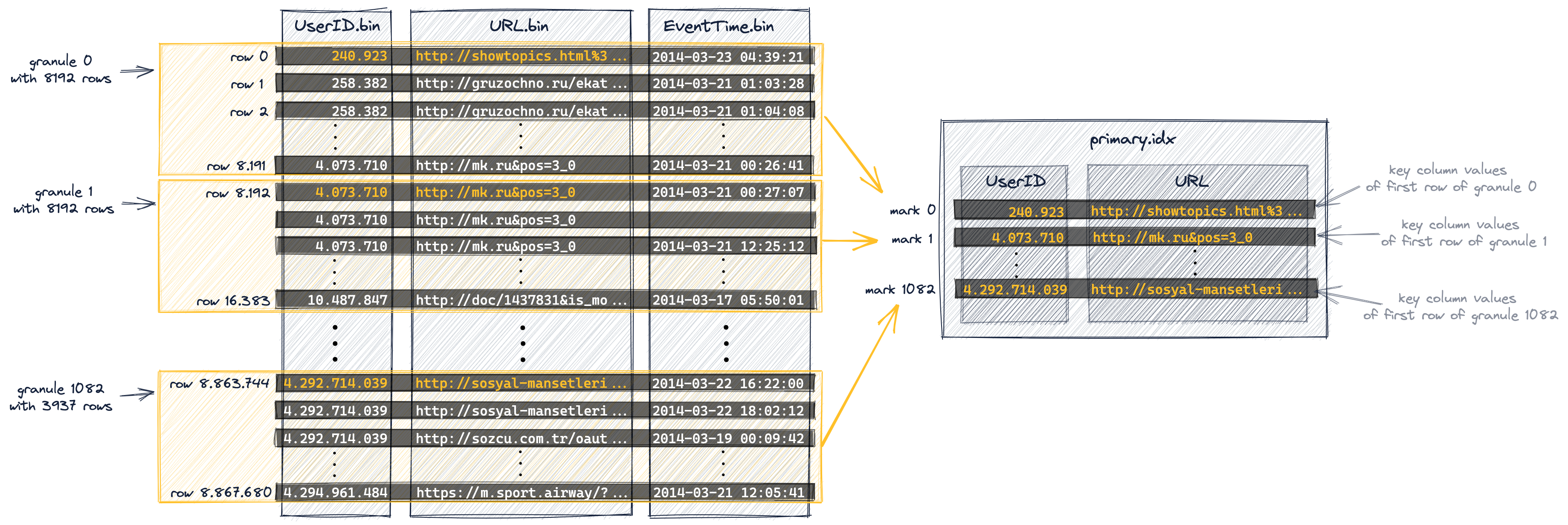 The following illustrates in detail how ClickHouse is building and using its sparse primary index. Later on in the article, we will discuss some best practices for choosing, removing, and ordering the table columns that are used to build the index (primary key columns).