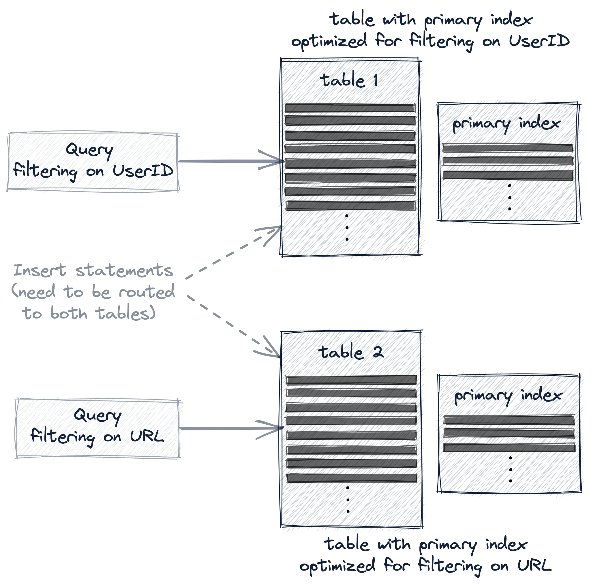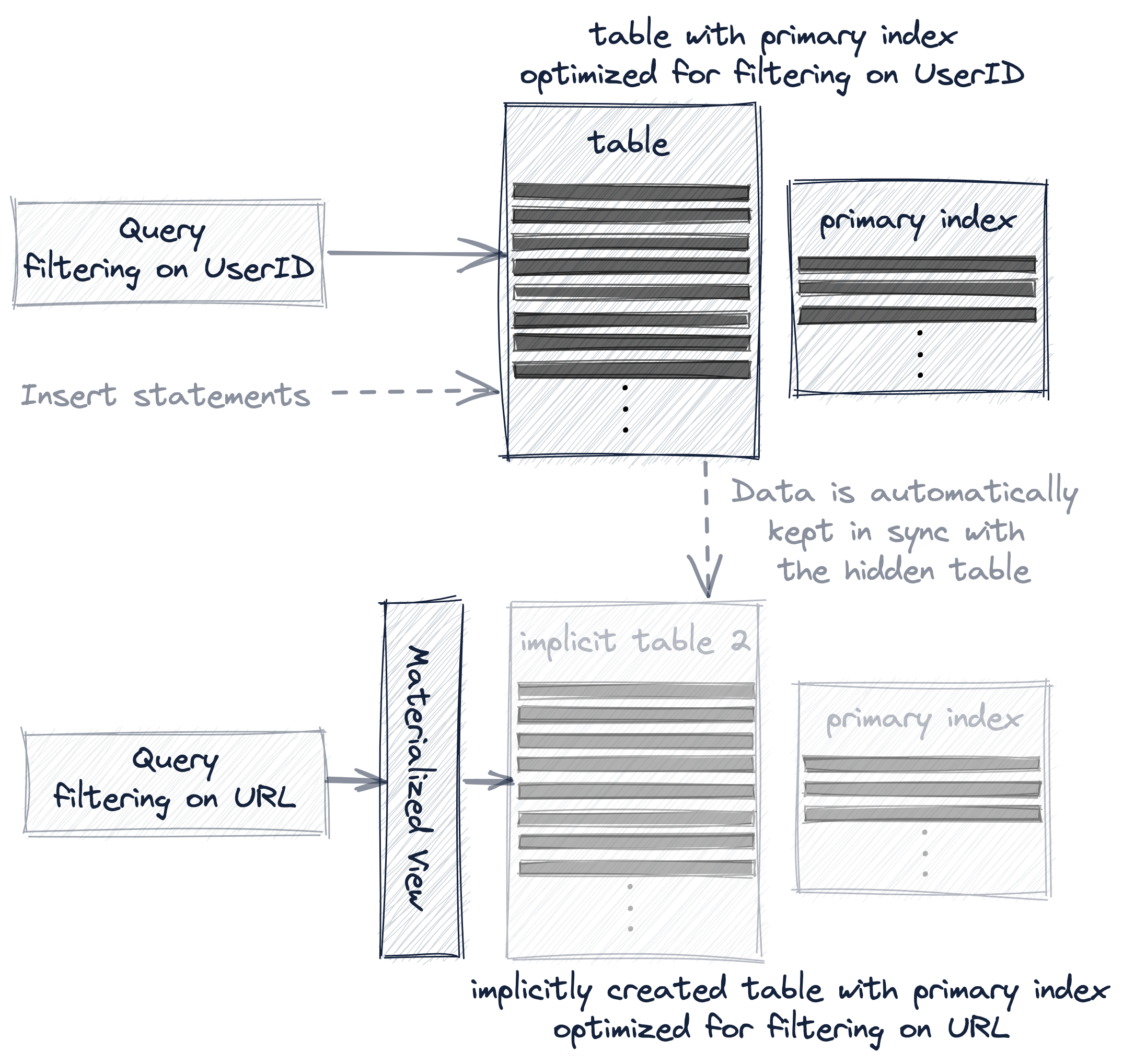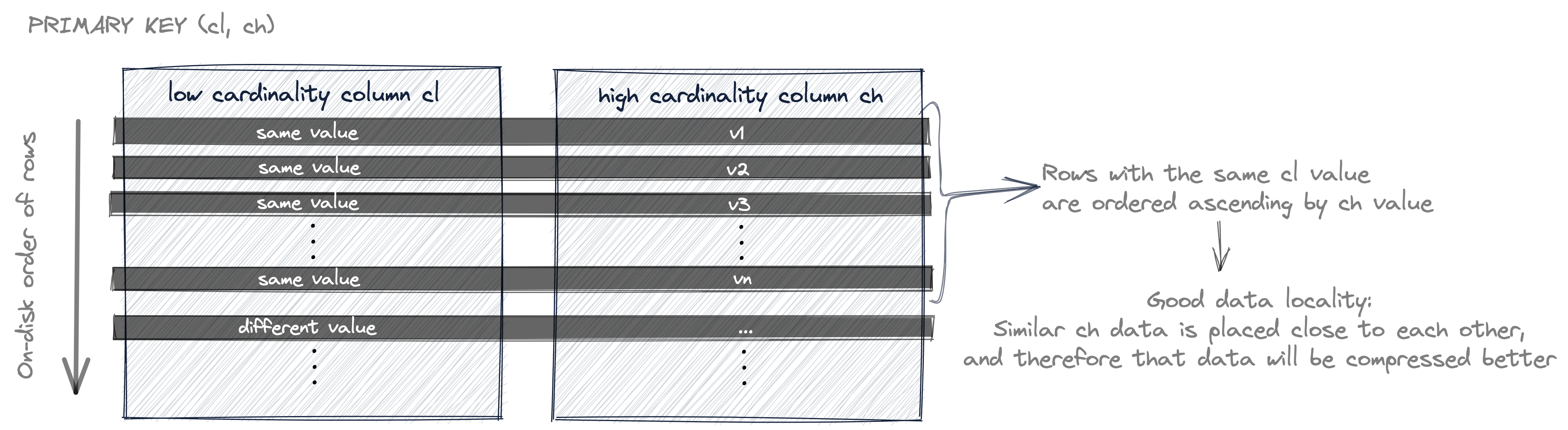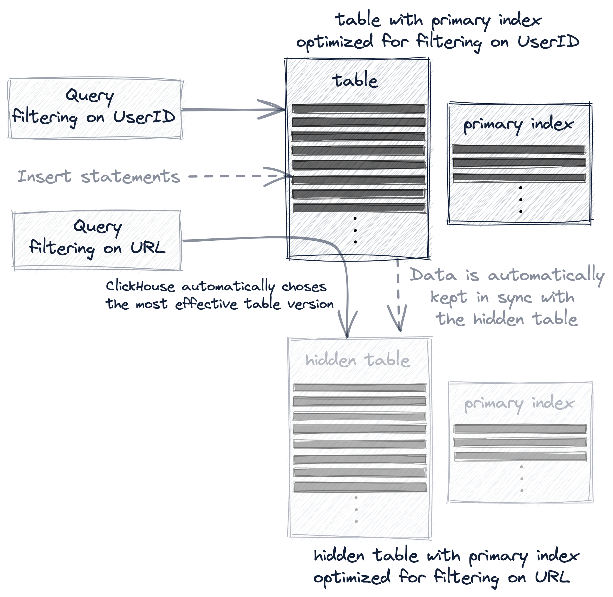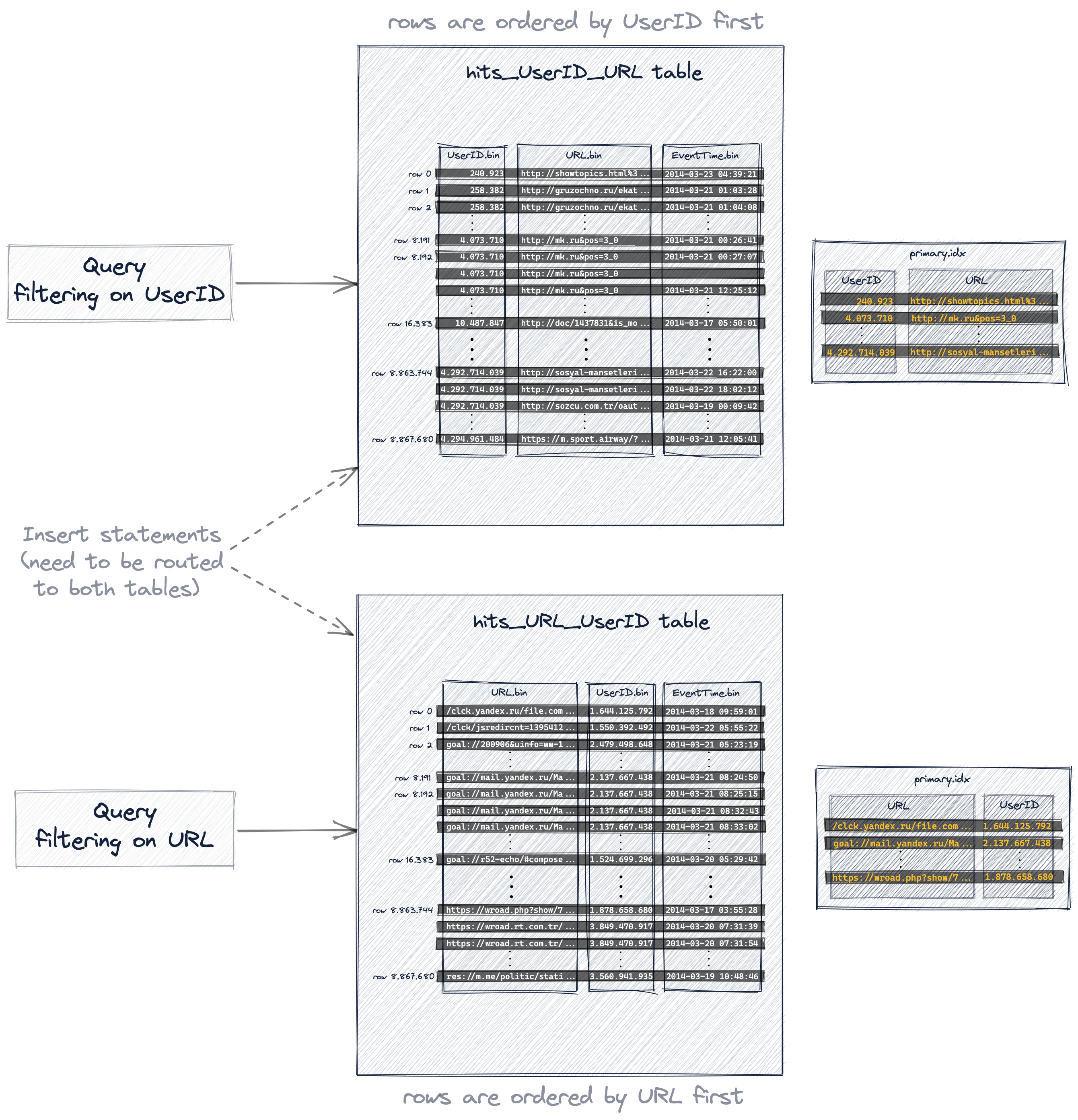 To make this (way) more efficient and (much) faster, we need to use a table with a appropriate primary key. This will allow ClickHouse to automatically (based on the primary key’s column(s)) create a sparse primary index which can then be used to significantly speed up the execution of our example query.